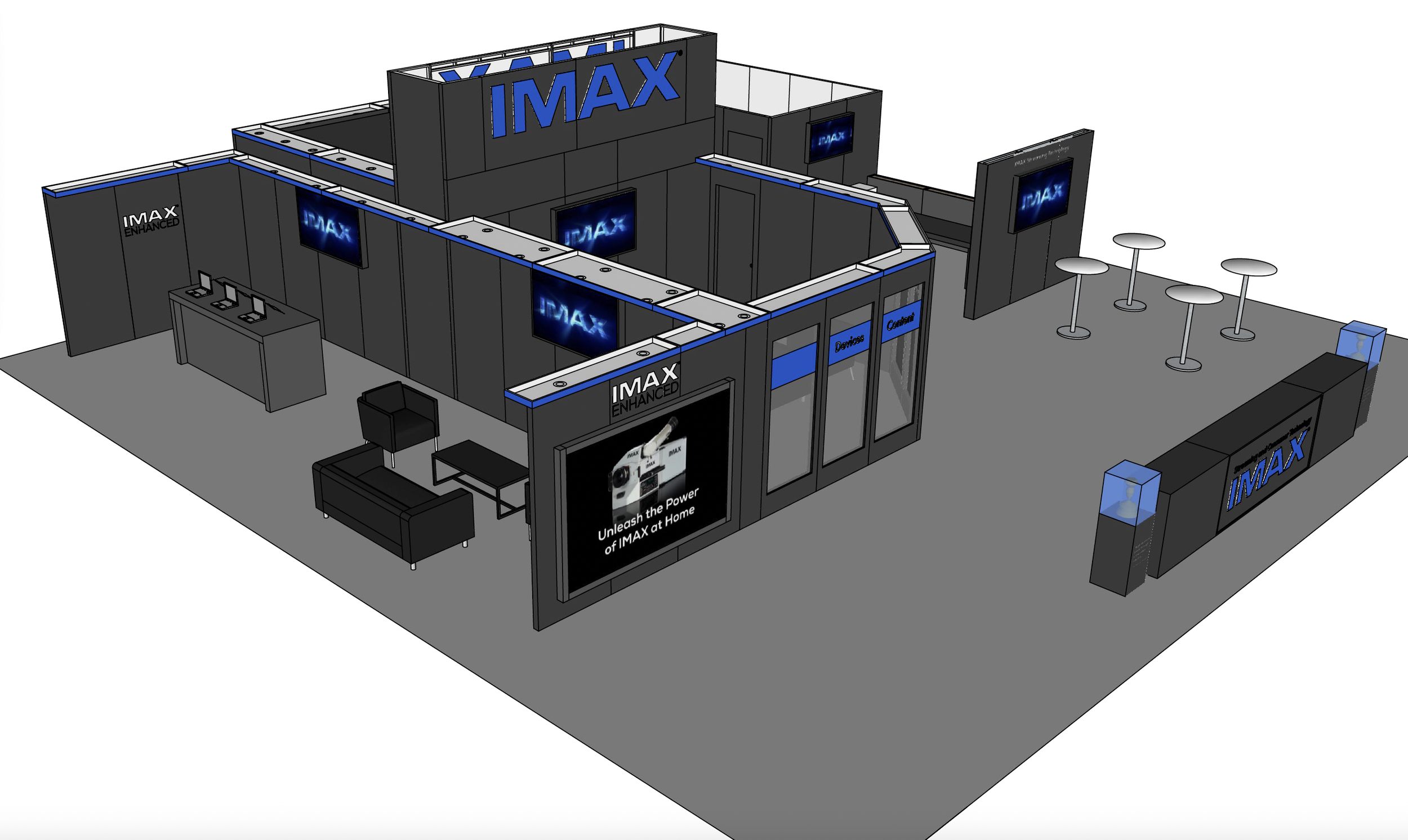 IMAX aimed for a simple and striking booth to showcase their latest streaming programs and demonstrate that they offer more than just big films. Each area served a clear purpose. A highlight was an in-home movie theater designed for excellent sound and light control, offering a cozy and immersive viewing experience.